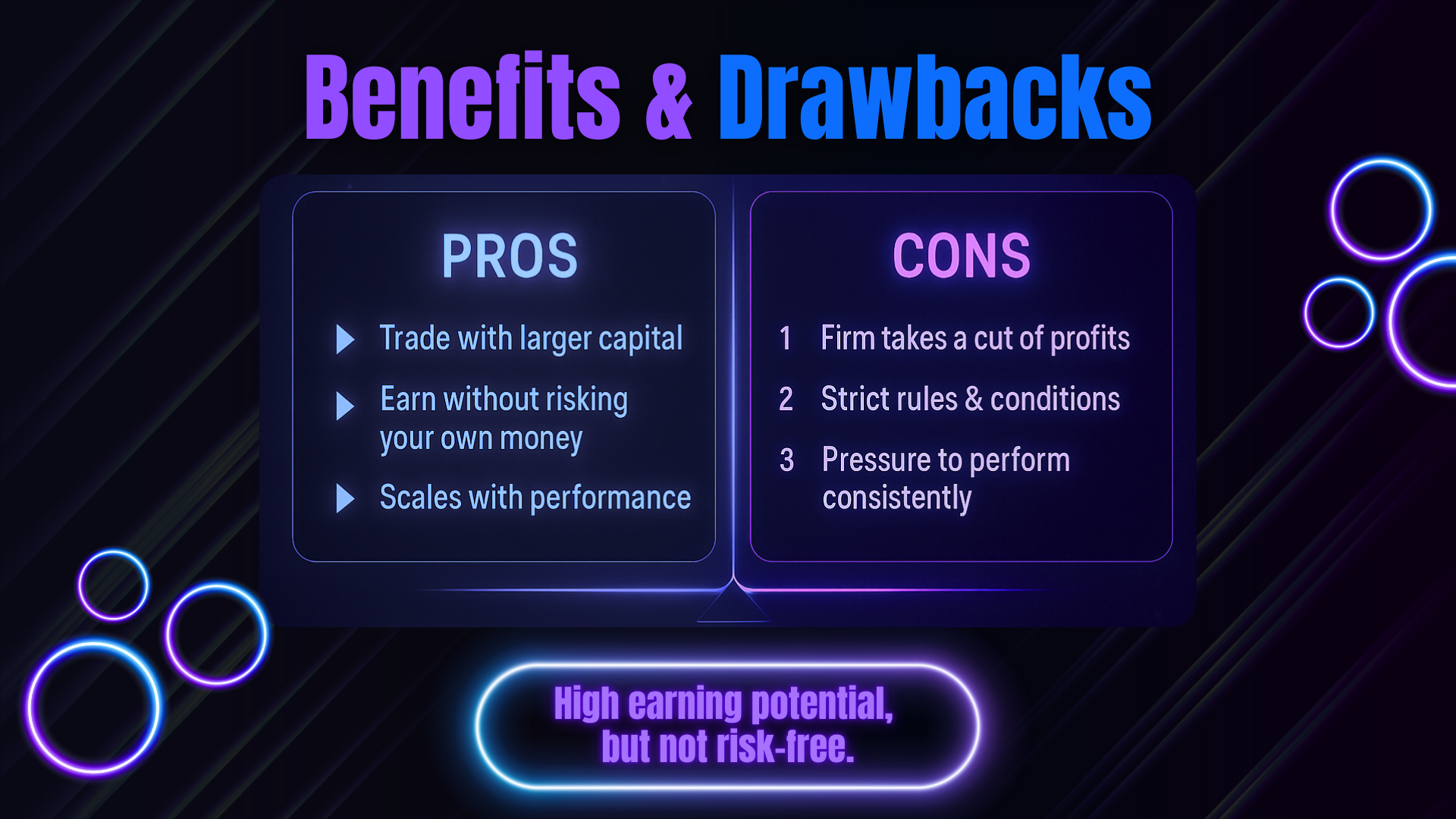 Dado que la cuenta de operaciones está financiada por la empresa, su riesgo financiero personal se limita a la comisión del programa o al coste de evaluación. No arriesgas tu propio capital de negociación.